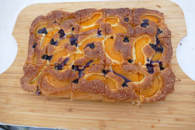 Snijd de perziken in plakjes en verdeel deze met de resterende bessen over de cake.