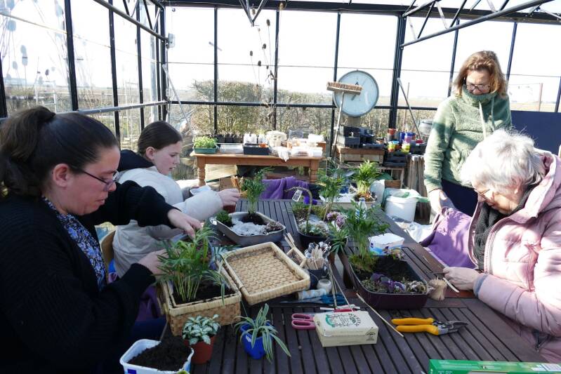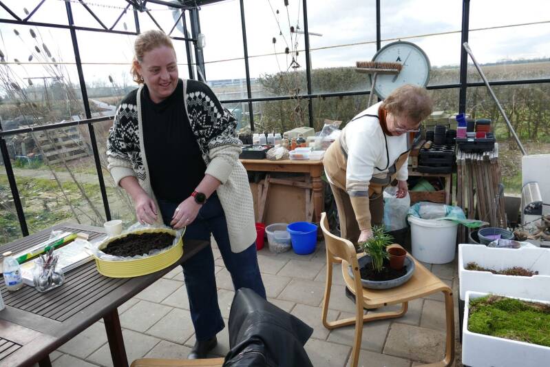 Donderdagmorgen 13 maart: helaas 2 zieken, maar we maken het toch gezellig in de kas.