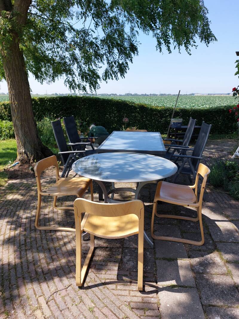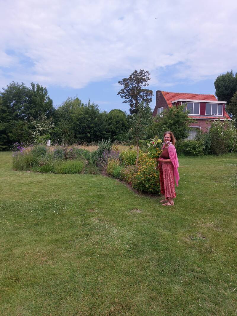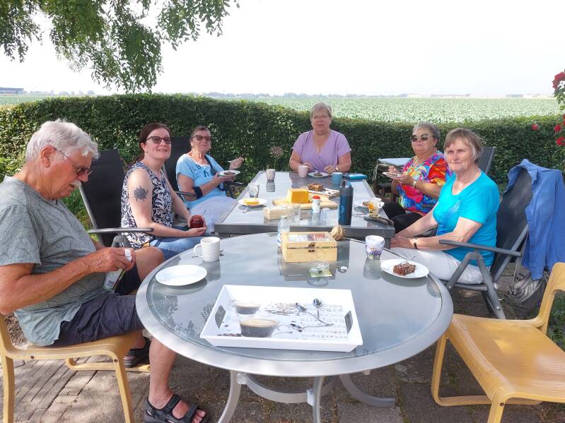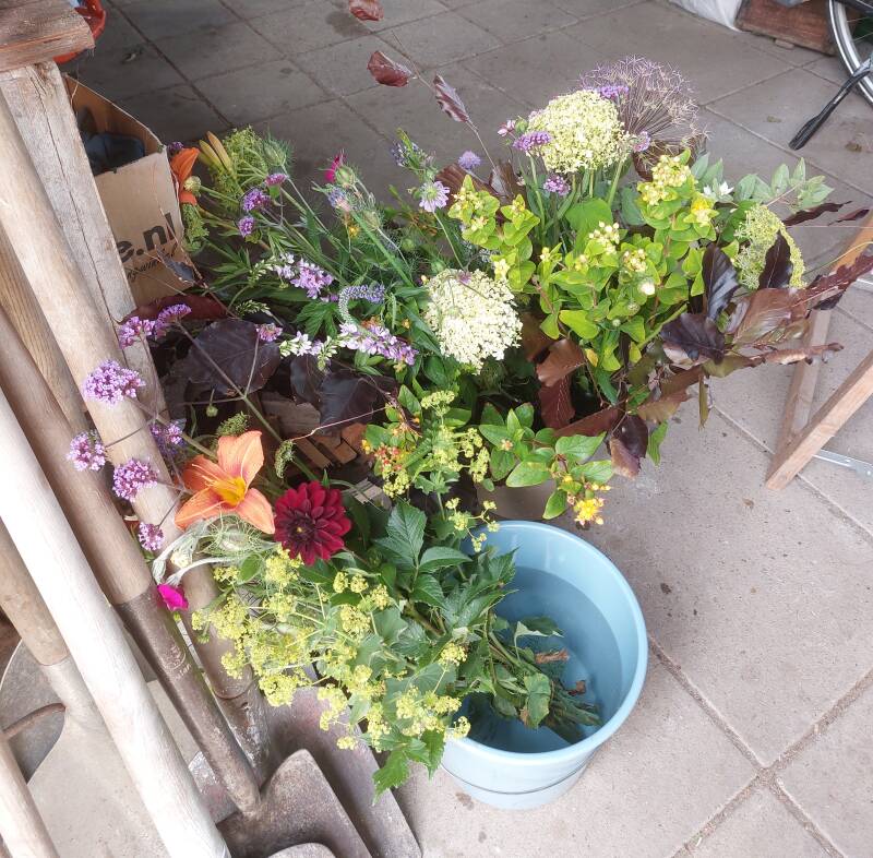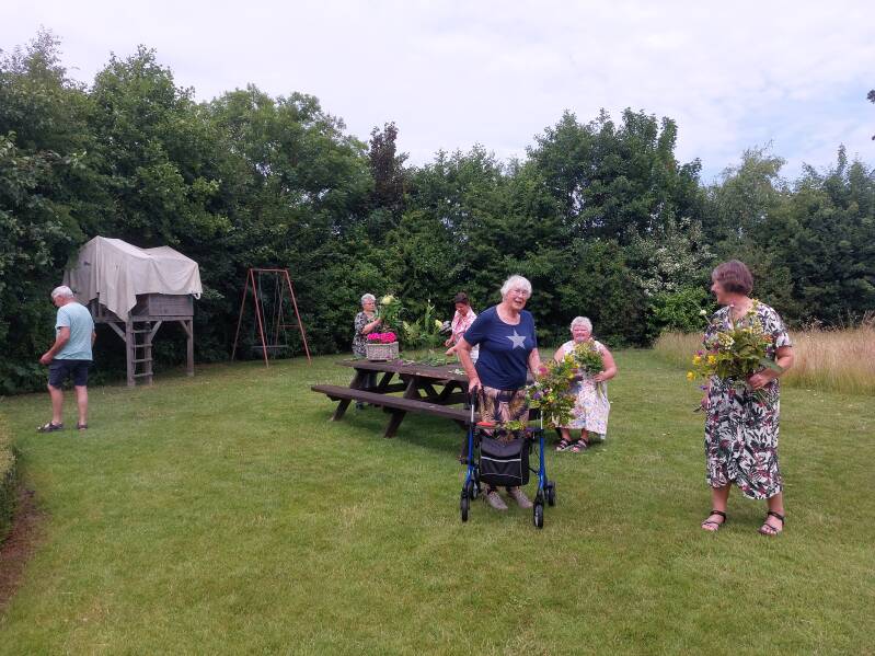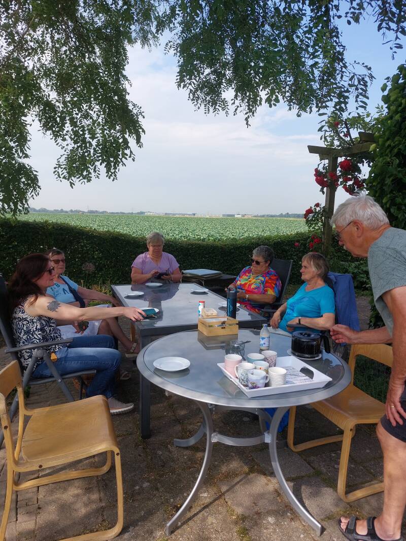 Warm, warmer, warmst. Maar het is heerlijk toeven onder de valse Acacia (Robinia pseudoacacia). We beginnen met koffie en cake/courgettecake van resp. Cobi en Len. Met eventueel aardbeien/rabarberjam en slagroom. Daarna instructie en de tuin in! De boeketten mogen in de schuur wachten tot ze mee naar huis gaan.