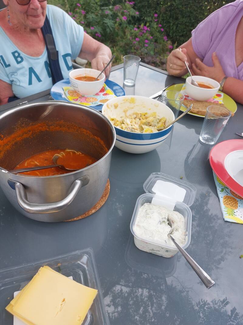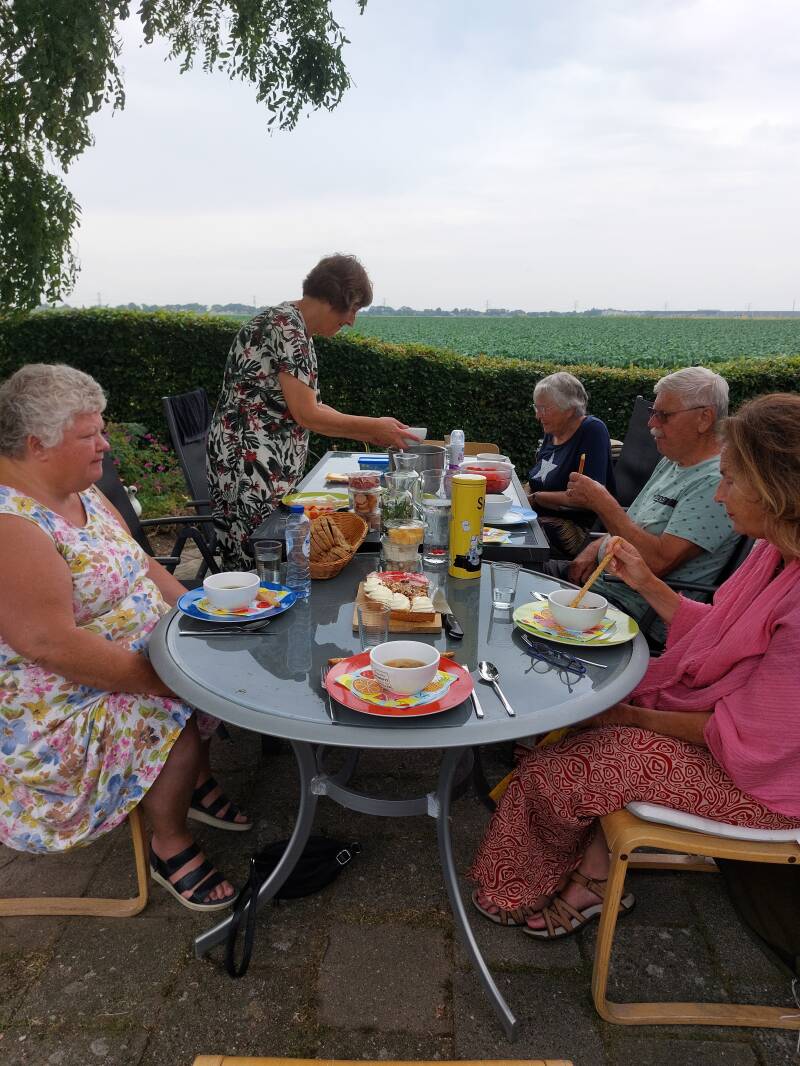 De picknick bestond uit lekkere witlofsalade met tonijn en nog veel meer van Marjolein, Tomatensoep van Nelleke met brood van Arjo, heerlijke hartige taart van Toos en monchoutoetje van Wilma. Het was smullen geblazen!