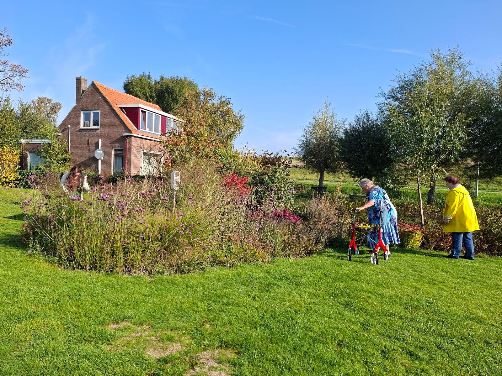 We hadden natuurlijk eerst koffie met appeltaart en slagroom. Een gezellig praatje en instructie. Daarna naar buiten: de tuin in, op zoek naar materialen. In de kas stonden kruisdistels en lag macramétouw of herstlint of jute.
