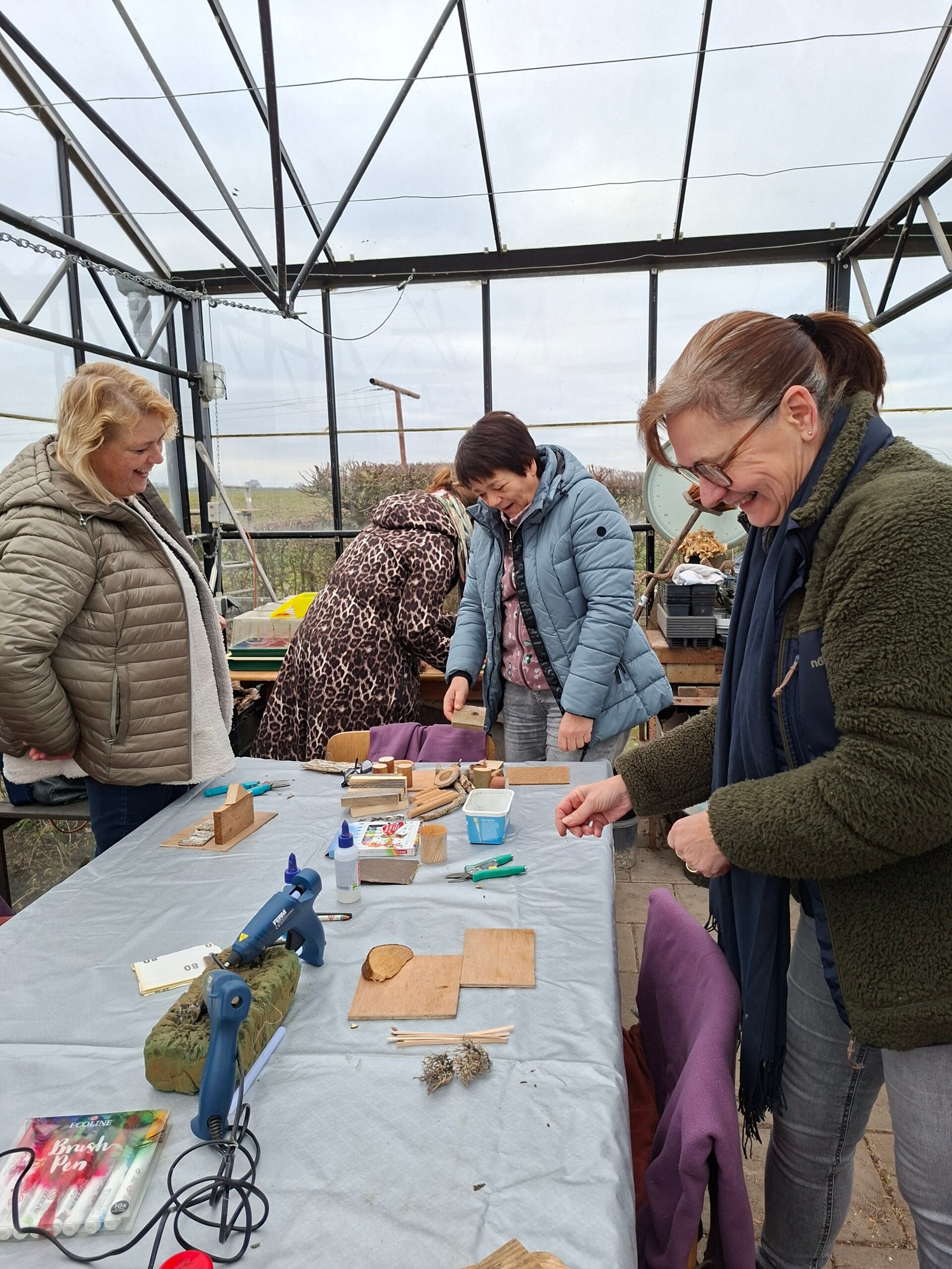In de sombere februarimaand was het gelukkig wel gezellig in de kas, de zon piepte af en toe door de wolken heen, maar de deelnemers van donderdag 12 februari hadden er amper oog voor, ze waren druk aan het grutselen, of was het vandaag toch echt knutselen? Mooie miniatuurwerkjes zijn er gemaakt, maar we begonnen met een huisje in het groen om op te snoepen.